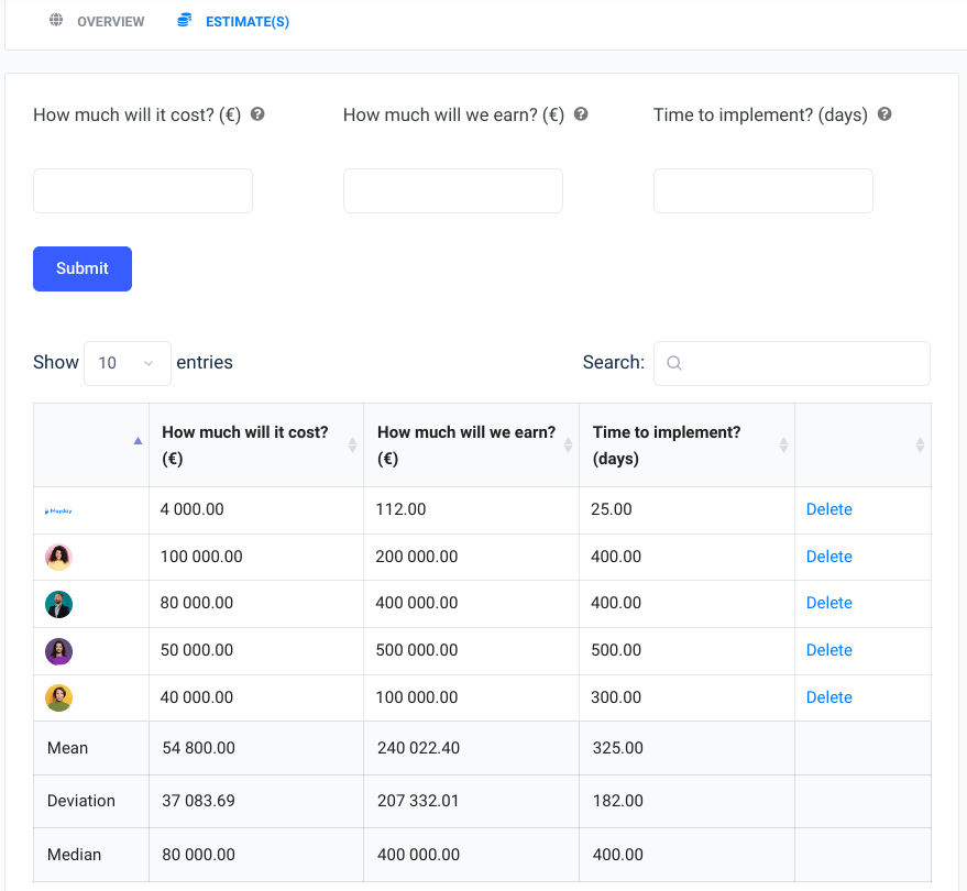 Cette fonctionnalité est très utile pour l’innovation collaborative car elle permet de prendre en compte les considérations économiques dans l’évaluation des contributions et de sélectionner les projets les plus viables économiquement (gains, coûts, et délais escomptés…). Il s’agit d’une fonctionnalité complémentaire aux avis des membres et aux avis des experts.