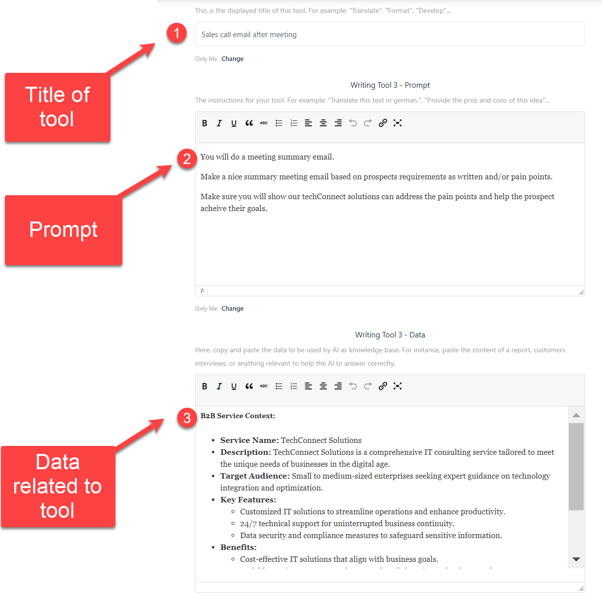 De la même manière, un utilisateur peut construire ses propres outils. Pour ce faire, il lui suffit de fournir un titre, un prompt et le cas échéant, des données contextuelles le concernant. Ensuite, le prompt sera appliqué à tout texte renseigné dans le champ de description de son outil. Cela donne à l’utilisateur une flexibilité et un contrôle accrus sur la manière dont il souhaite interagir et utiliser l’outil, permettant une personnalisation plus poussée en fonction de ses besoins spécifiques :