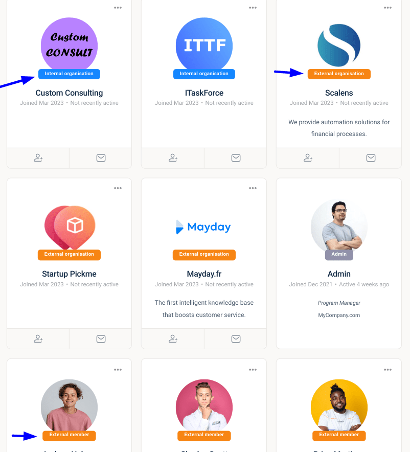 De plus, grâce à cette faculté, les utilisateurs peuvent connaître en un clin d’oeil quel est le type de membre de leur interlocuteur, et ainsi favoriser la collaboration, par exemple entre les membres internes et les membres externes de l’organisation.